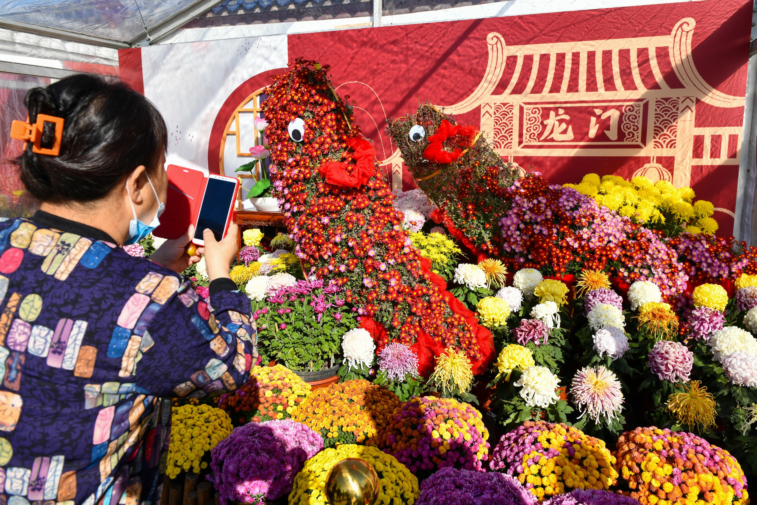 天坛菊展展区以祈年门为轴,分为东西两个区域。祈年门西面以主题花境为主,分为“福启新岁”“福禄双至”“寿山福海”“喜鹊报福”4个主题展棚,分别以“葫芦”“鲤鱼”“寿桃”“喜鹊”为主要造型,表达了前程似锦、福寿安康、吉祥如意等美好寓意,与天坛祈年殿遥相呼应,相映成趣。