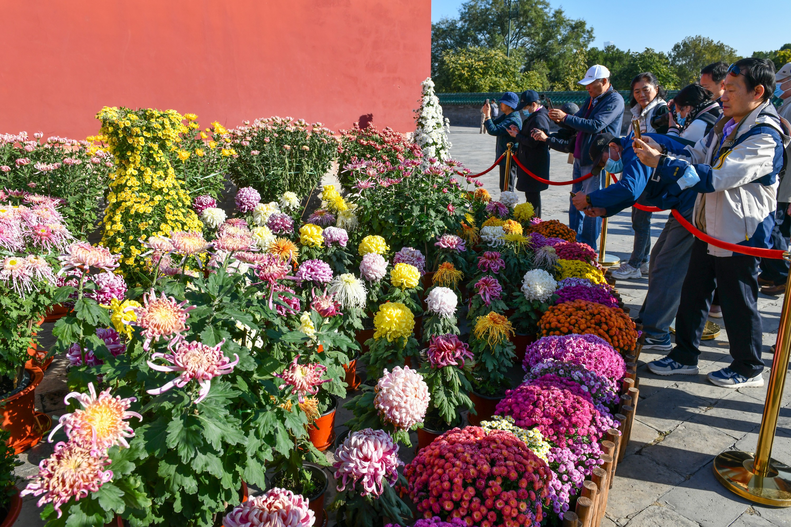 祈年门东侧展区则以“大立菊”“立菊”“盆景菊”“标本菊”展示为主。记者了解到,天坛公园目前自育、培育菊花品种达500个,此次展出平瓣类、匙瓣类、管瓣类、桂瓣类、畸瓣类5类20余款花型,中国五大名菊之首—“帅旗”,天坛自育品种—“瑞雪祈年”“太真含笑”等菊花品种都在展览中与市民游客见面。