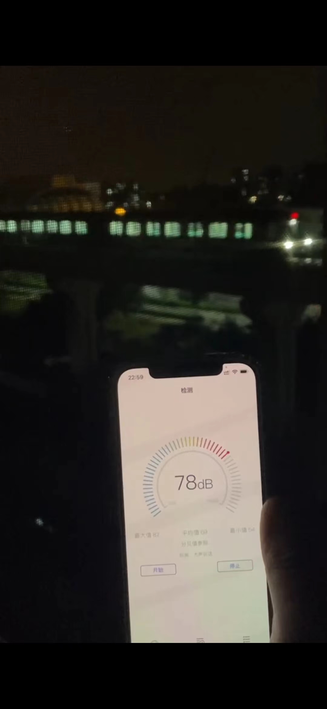 在业主拍摄的视频中记者看到,晚上10点59分,一趟列车从瀛海站驶向车辆段。在车辆经过小区时,窗外便传来了明显的“咣当咣当”声。在打开窗户的情况下,业主用手机测试了地铁经过时的分贝值,屏幕上的数字在65分贝到83分贝之间跳动。