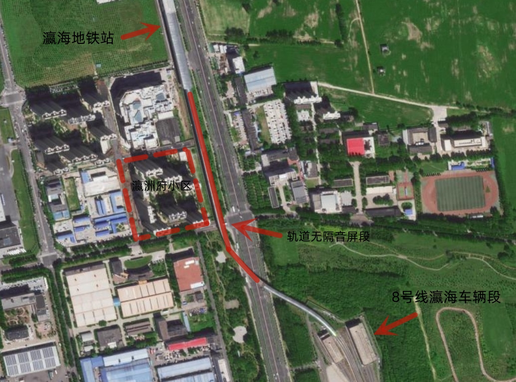 瀛洲府小区位于大兴区瀛海地铁站西侧,其中,位于小区最东侧的1号楼和8号楼,距离地铁8号线的轨道直线距离不足100米,该处的地铁列车是在地面轨道上运行的。