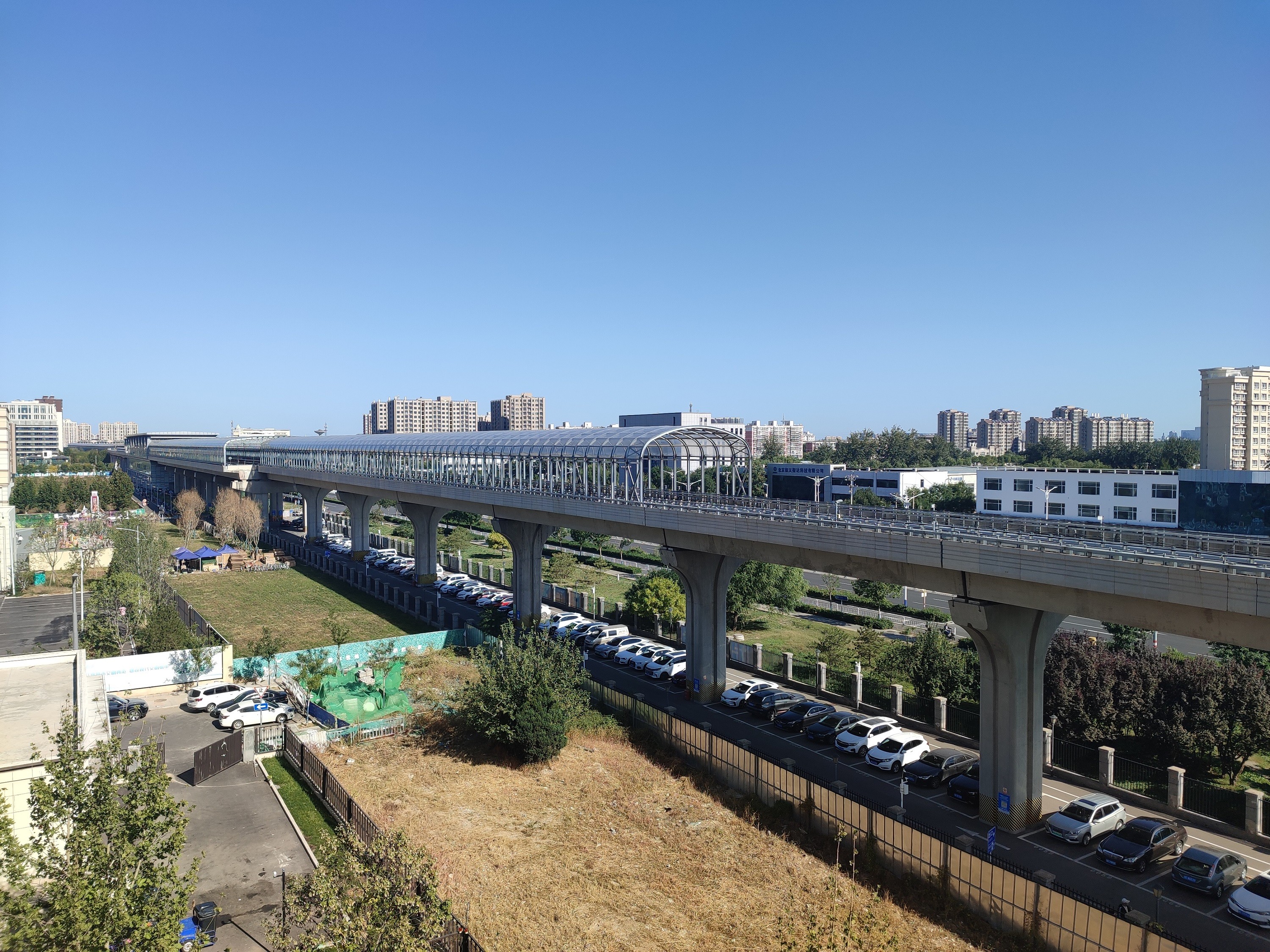 10月15日,记者从小区1号楼向东俯瞰时发现,与一般的地上地铁相比,这里的线路比较特殊。轨道在经过小区这一段区间时并非走直线,而是形成了自北向东南方向延伸的一个弯道。地铁8号线的终点瀛海站位于小区北侧400余米处,而沿着小区前的轨道向东南方向则是8号线瀛海车辆段。