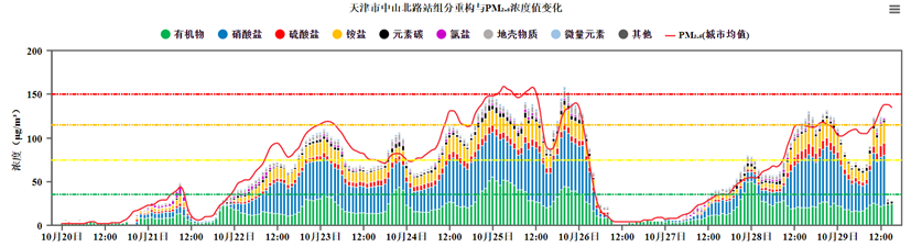 北京市受三条区域传输通道综合影响,叠加本地移动源排放的NOx及其二次转化,PM2.5浓度显著上升。来源解析结果显示,北京市此次过程中受到西南、东南、偏东三条主要传输通道影响,但29日上午本地贡献上升,至中午时已接近40%。北京市PM2.5组分特征显示,污染期间城区硝酸盐占比约为40%,高出边界站点,表明本地机动车、工程机械等排放的NOx及其二次转化,推高了市区PM2.5浓度。