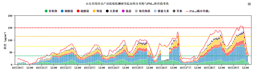 截至10月30日8时,京津冀及周边地区共16个城市累计发生32天次PM2.5中度及以上污染;其中,山东省菏泽市出现2天重度污染,河北省邢台、保定、衡水市,河南省开封、周口市分别出现1天重度污染;PM2.5日均浓度峰值为224微克/立方米(菏泽,10月28日),小时浓度峰值为242微克/立方米(开封,10月28日2—3时)。北京市出现2天轻度污染(10月23—24日)、1天中度污染(10月29日),PM2.5日均浓度峰值为134微克/立方米,小时浓度峰值为154微克/立方米(10月29日20—21时)。目前,区域污染过程仍在发展中。