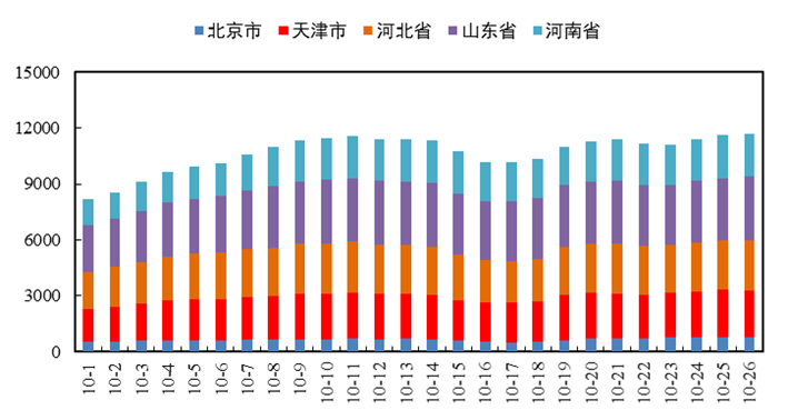 区域工业企业、重型货车活动水平和秸秆火点数量环比上升,污染排放呈增加趋势。在工业源方面,10月下旬以来,区域工业用电量较10月上中旬增长约5%,其中水泥、砖瓦等行业用电量增幅更为明显,钢铁、焦化、石化等行业用电量基本持平。在移动源方面,京津冀及周边地区重型货车交通流量处于秋冬季以来的高位,较10月上中旬偏高约14%。在面源方面,10月21—28日区域内累计发现火点325个,其中天津、河北(沧州、张家口)、河南(周口、驻马店、漯河)等地数量较多。