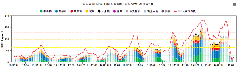 2023年10月22日起,区域气象条件转不利,PM2.5污染逐渐累积。23—24日,京津冀中部出现PM2.5轻至中度污染。25—27日,弱北风影响下京津冀空气质量逐渐好转,污染气团向山东、河南移动。28–29日,京津冀中南部、河南北部一带转为气象辐合区控制,出现近地逆温和高湿条件,区域空气质量再次转差。