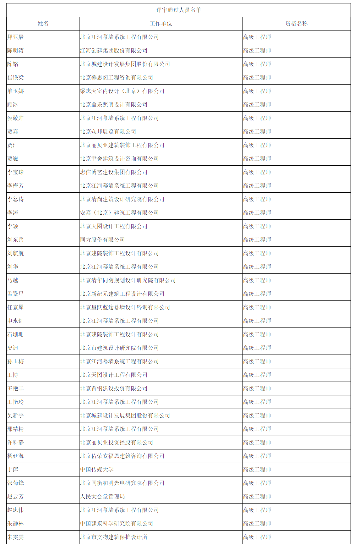 北京市工程技术系列(建筑装修设计)高级专业技术资格评审委员会于2023年10月20日召开会议,拜亚辰等38人(名单附后)通过了高级工程师专业技术资格评审。根据《北京市职称评审管理暂行办法》(京人社事业发〔2020〕12号)的规定,经复核,现予以公示。