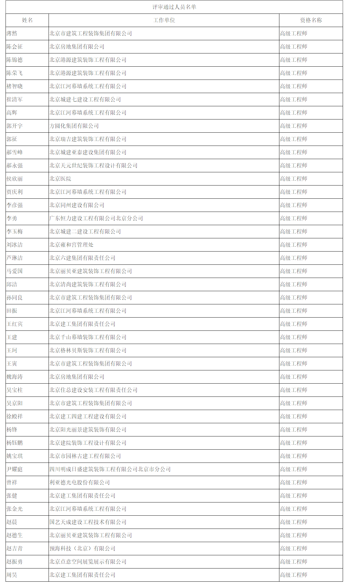 北京市工程技术系列(建筑装修施工)高级专业技术资格评审委员会于2023年10月20日召开会议,薄然等42人(名单附后)通过了高级工程师专业技术资格评审。根据《北京市职称评审管理暂行办法》(京人社事业发〔2020〕12号)的规定,经复核,现予以公示。