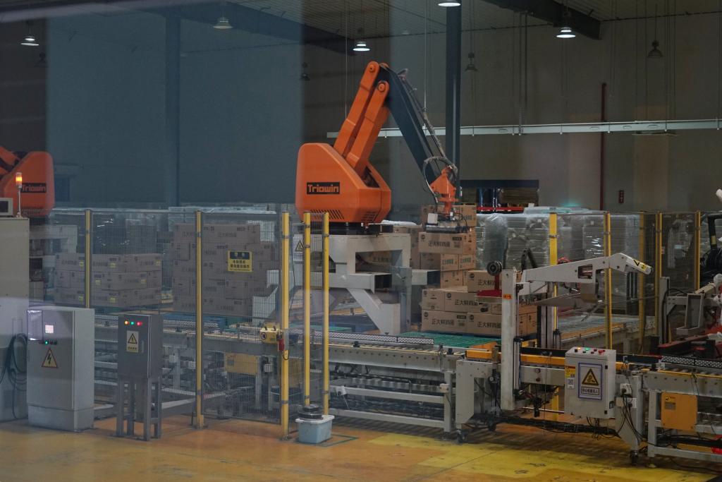走进位于慈溪市现代农业开发区的慈溪正大蛋业有限公司的分级车间,机械手正将包装好的鸡蛋整齐地码垛。