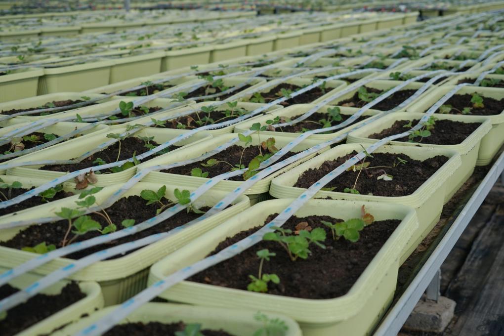 10月30日,在坎墩玉兰果蔬农场,水肥一体化的滴灌管道“爬”过一垄垄草莓幼苗。新华社记者林光耀 摄