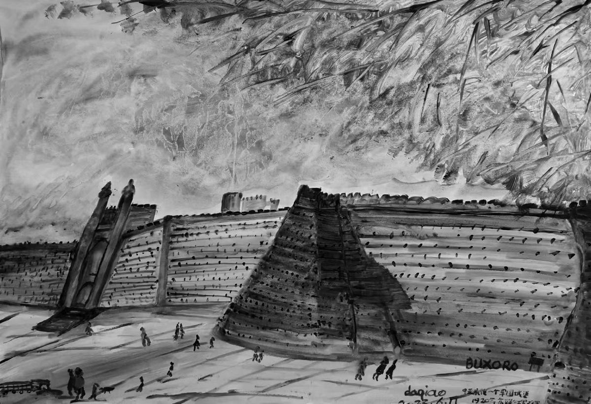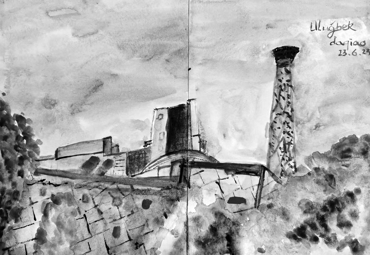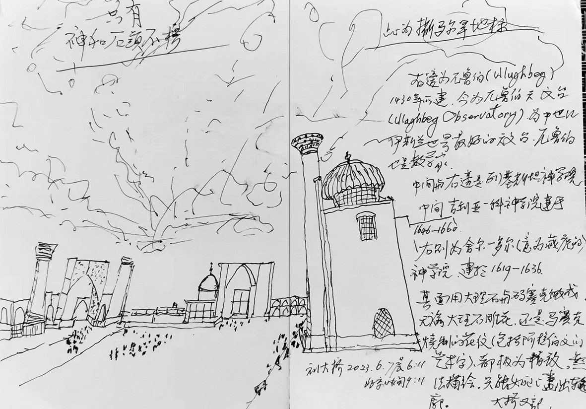 登上二楼,独自凭栏,兀鲁伯天文纪念馆的中心庭院一览无余。从烧焦又新修的旋转楼梯回到中庭庭院,我急速地画了一图。回到家,多天之后又用水彩画了一图。当然,我没有忘记在离开这个广场前,画下整个广场的浩大。画好后,写了一句“只有石头与神不朽”。撒马尔罕,毁灭与重生,战争与和平,前行与后退,纠缠与轮回。天空乌云密布,速写的杂乱线条,不知是不是要表达这些。这些太沉重,但沉重是人类的宿命。历史,常常处于一个幽深且迷乱的隧道之中,但是,和平是永恒的主题。伫立吉利斯坦广场,见不同肤色的游人熙来攘往,我相信。