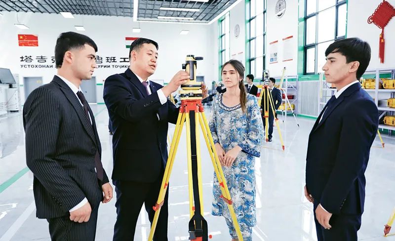“鲁班工坊”,主要目标是为合作国家培养高素质技术技能人才,被称为“一带一路”上的“技术驿站”。图为2023年4月12日,在塔吉克斯坦首都杜尚别的“鲁班工坊”内,一位来自天津城市建设管理职业技术学院的老师向学生讲解测绘仪器使用方法。 新华社发 奥斯帕诺夫/摄