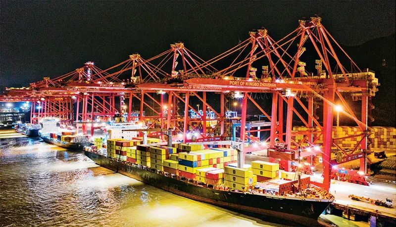 近年来,浙江省宁波舟山港发挥区位优势,不断拓展海陆运输通道,推进高质量共建“一带一路”行稳致远。图为2023年9月21日,在该港穿山港区集装箱码头,“地中海琳妮三号”轮进行集装箱吊装作业。 新华社发 蒋晓东/摄