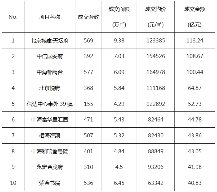 北京市住宅1-9月份成交排名