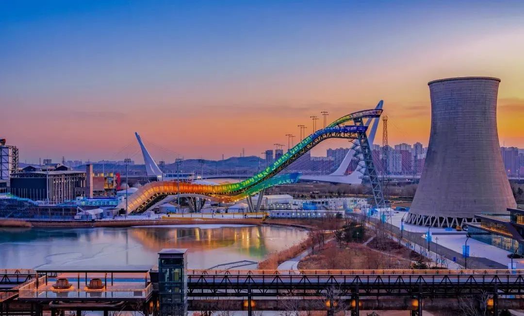 首钢滑雪大跳台在晚霞与灯光的映衬下璀璨生辉