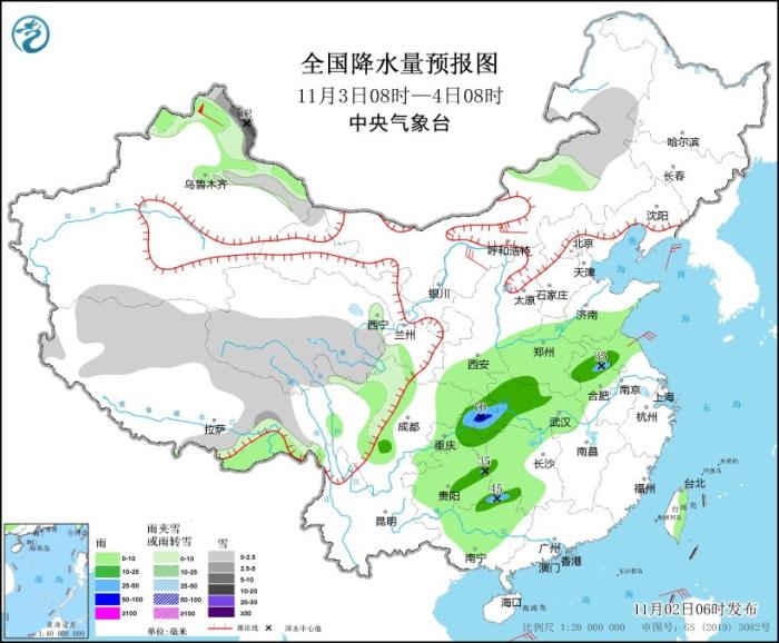 11月3日08时至4日08时,新疆北部、西藏北部和东部、青海中部和南部、内蒙古东部、川西高原北部等地部分地区有小到中雪或雨夹雪,其中,新疆阿勒泰等地部分地区有大雪或暴雪(10~12毫米);重庆中部和东部、湖北中部和西部、安徽北部、贵州东部、湖南西部、广西东北部等地部分地区有中到大雨,其中,湖北西南部、重庆东北部等地局地有暴雨(50~70毫米)。内蒙古西南部部分地区有5~7级风,其中,新疆北疆北部部分地区有7~8级风。