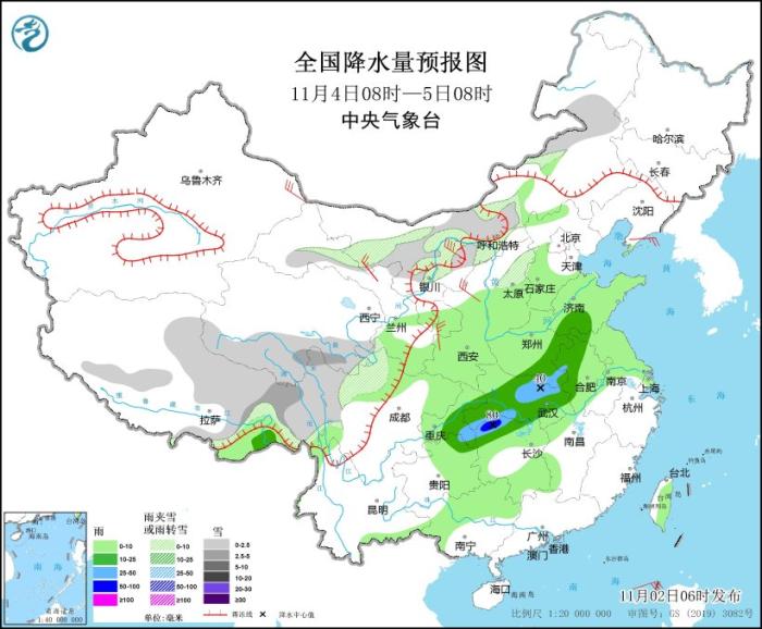 11月4日08时至5日08时,西藏北部和东部、青海南部、甘肃北部、内蒙古、川西高原等地部分地区有小到中雪或雨夹雪;重庆中部和东部、贵州东北部、湖南北部、湖北、安徽西部和北部、河南西部等地部分地区有中到大雨,其中,湖南西北部等地局地有暴雨(50~80毫米)。内蒙古西北部、新疆东部、陕西中北部等地部分地区有4~6级风,其中,内蒙古西南部部分地区有6~7级风。