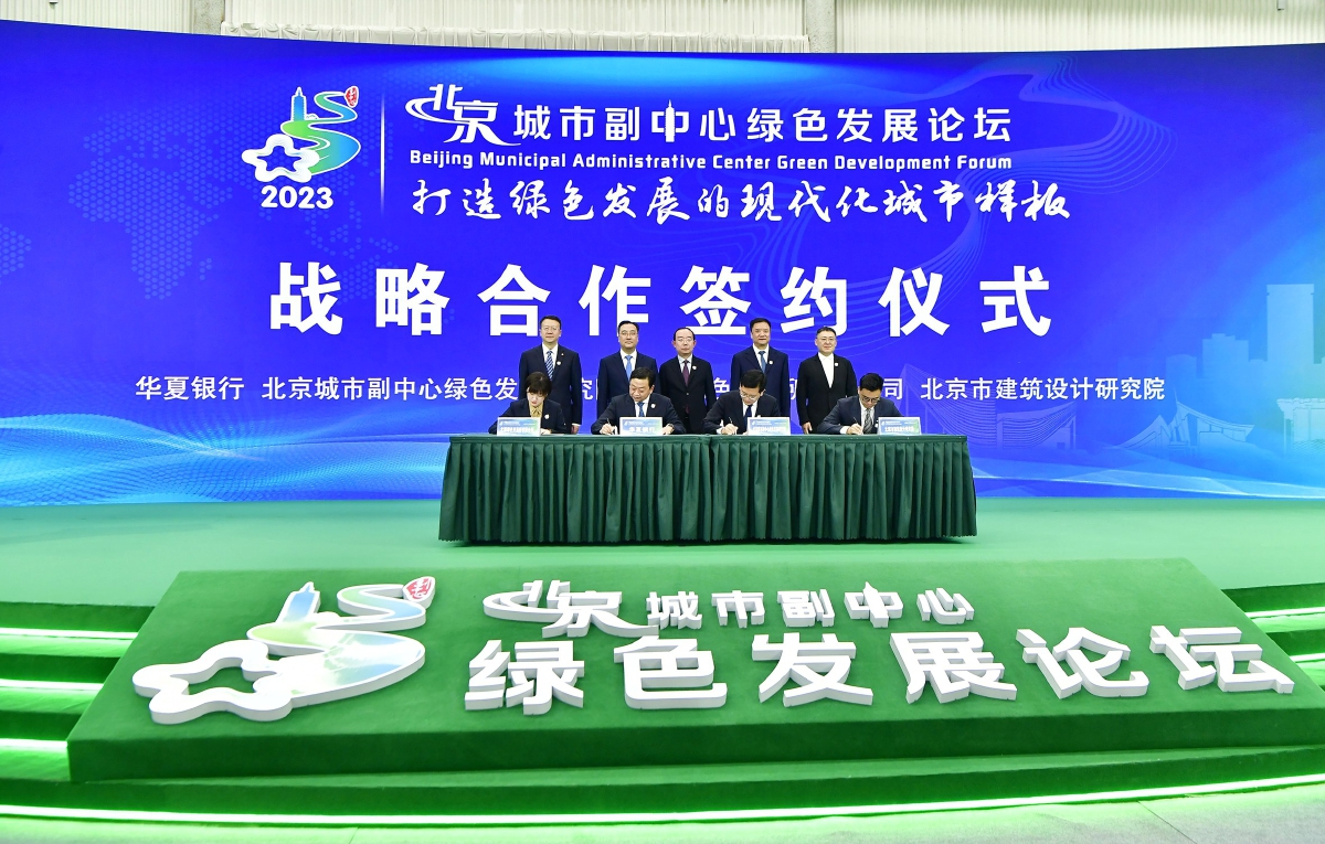为了推动各方加强伙伴关系,赋能北京尤其是北京城市副中心,开幕式上,华夏银行和北京绿交所签订了协议,合力共同支持城市副中心绿色实体经济发展;城市副中心绿色发展研究院和北京绿交所签订协议共同开展绿色低碳课题研究;城市副中心绿色发展研究院分别与华夏银行、北京建院签订协议,共同高水平举办绿色发展论坛。