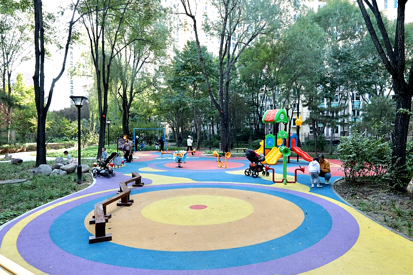 五瑞园位于朝阳区左家庄地区,总占地面积约2.4公顷。公园内主要有全龄儿童乐园、老年疗愈场地、活力运动场等特色空间,不少市民来此休闲散步。