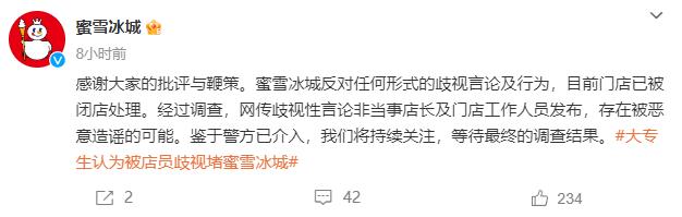 对此,@蜜雪冰城 11月3日晚表示,感谢大家的批评与鞭策。蜜雪冰城反对任何形式的歧视言论及行为,目前门店已被闭店处理。经过调查,网传歧视性言论非当事店长及门店工作人员发布,存在被恶意造谣的可能。鉴于警方已介入,我们将持续关注,等待最终的调查结果。