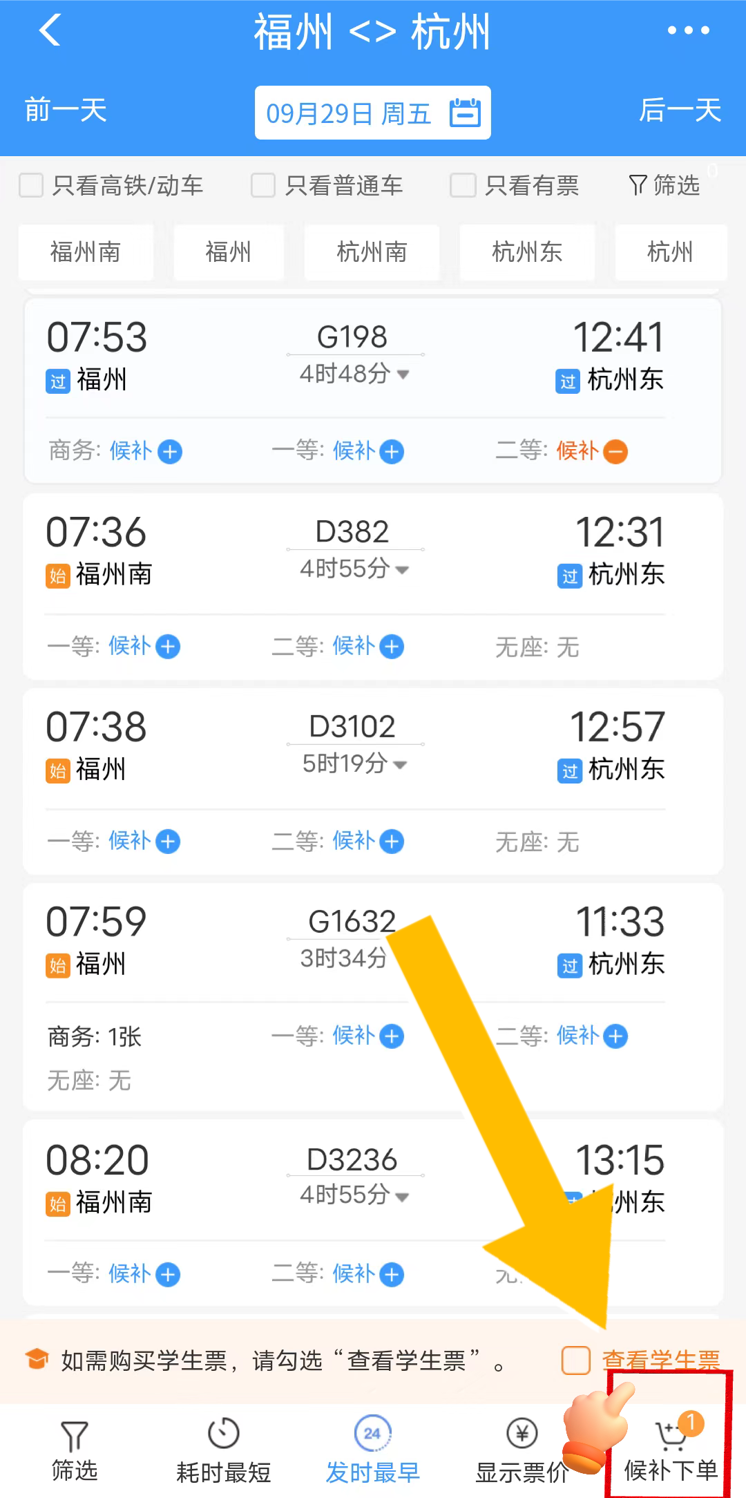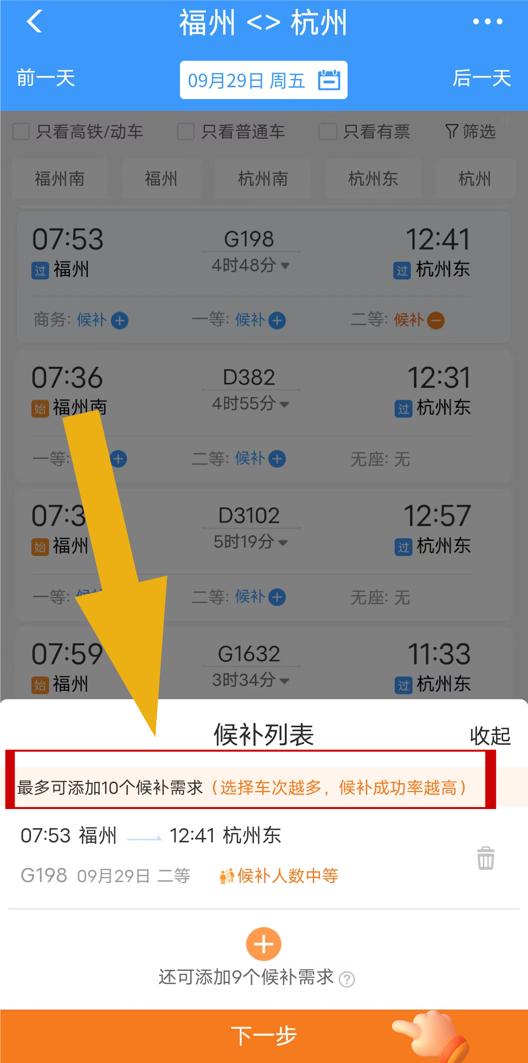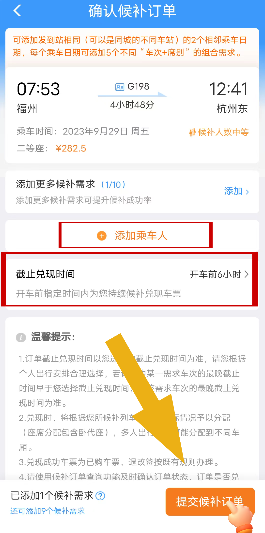 ●用户在提交候补订单时需确定候补截止兑现时间;候补终止时间不晚于开车前2小时。