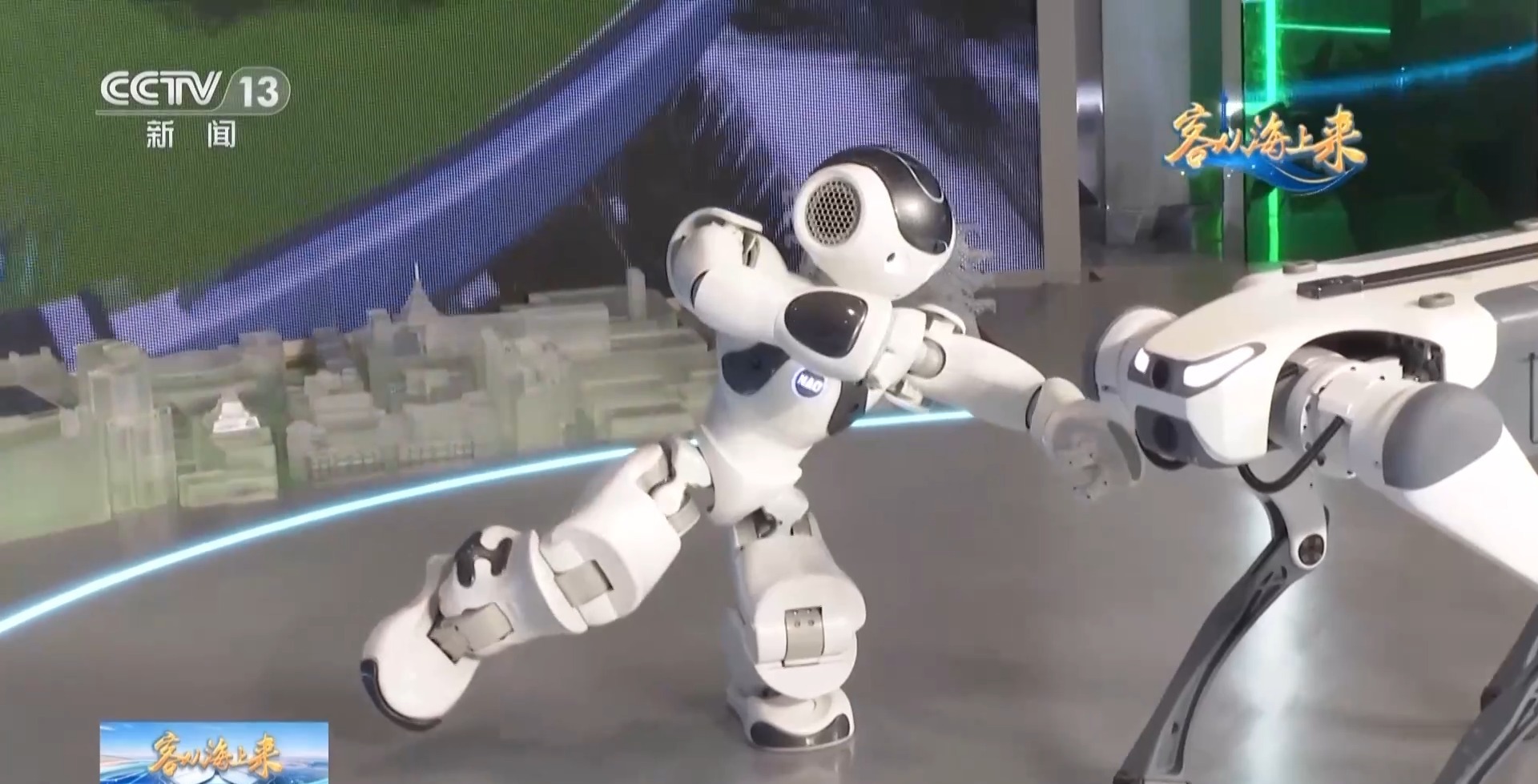 总台央视记者 陈俏:我所在的地方,是第六届进博会的人工智能体验区,在我身后就是未来城市空间的一种模拟的场景,这里有小机器人,还有小机器狗,他们都可以和我实现互动。