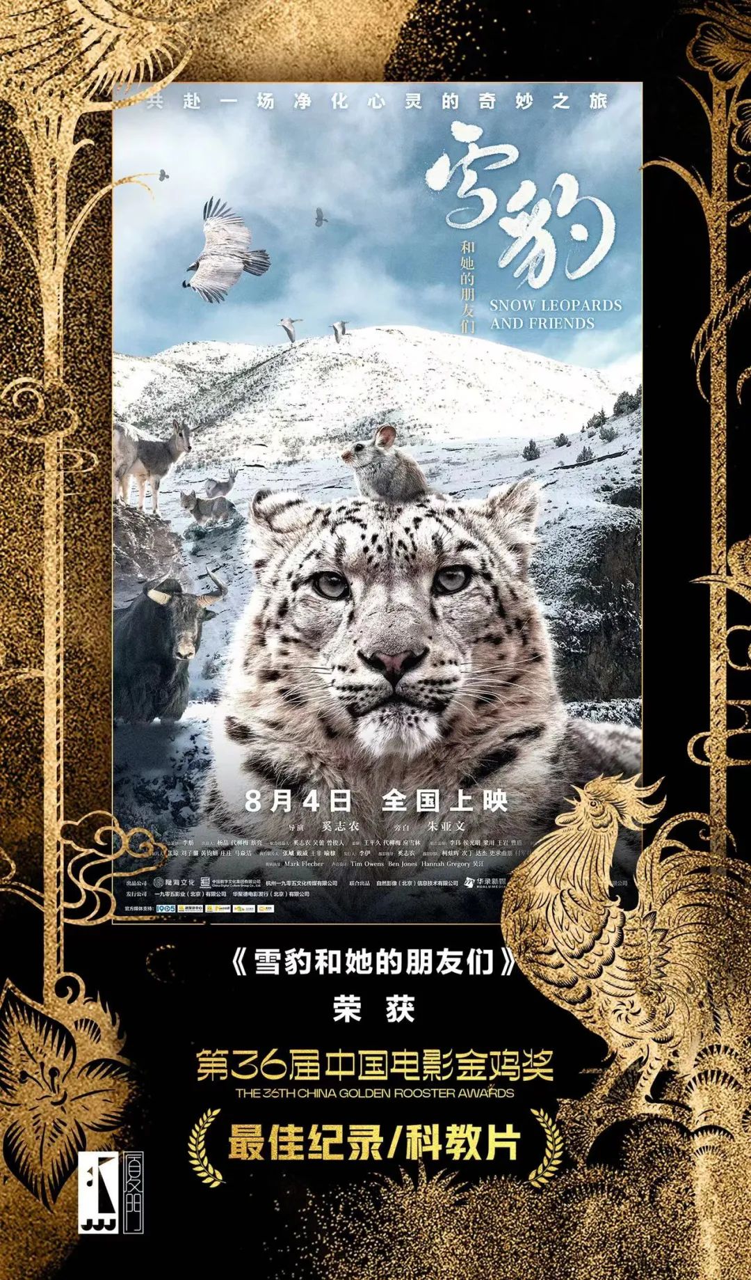 11月4日,第36届中国电影金鸡奖盛大揭晓,由石景山区企业华录新媒、杭州一九零五文化传媒与海口隐海文化传媒等公司联合出品的纪录片电影《雪豹和她的朋友们》荣获最佳纪录/科教电影!来自海拔4700米雪域高原的雪豹在光芒熠熠的金鸡盛典荣誉加冕。