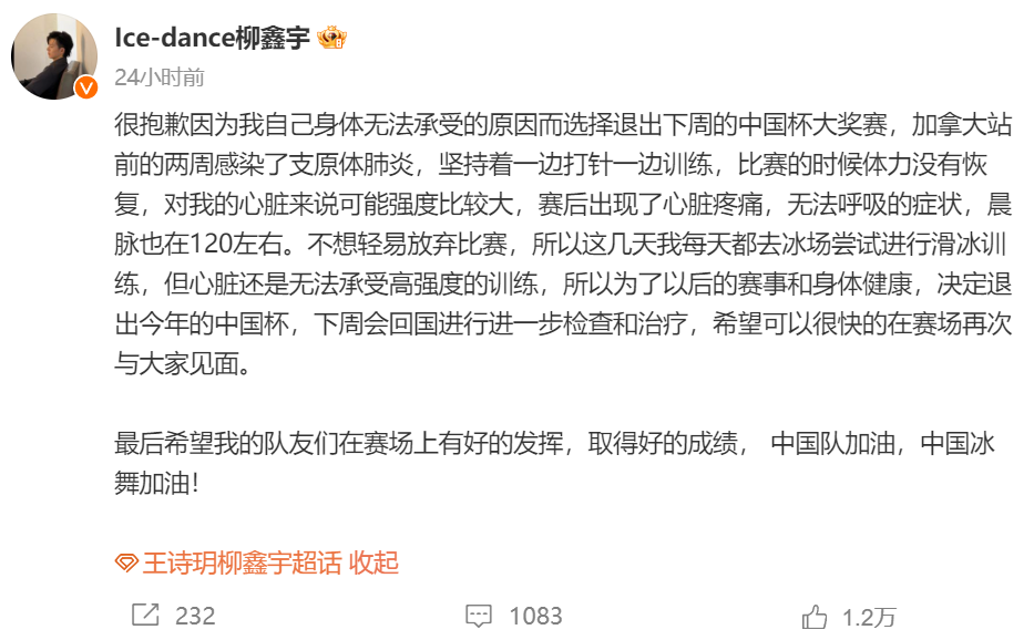 11月4日,中国花样滑冰冰上舞蹈运动员柳鑫宇发博称,因感染了支原体肺炎,身体还未完全康复,将退出下周的中国杯大奖赛。下周会回国进行进一步检查和治疗,希望可以很快的在赛场再次与大家见面。
