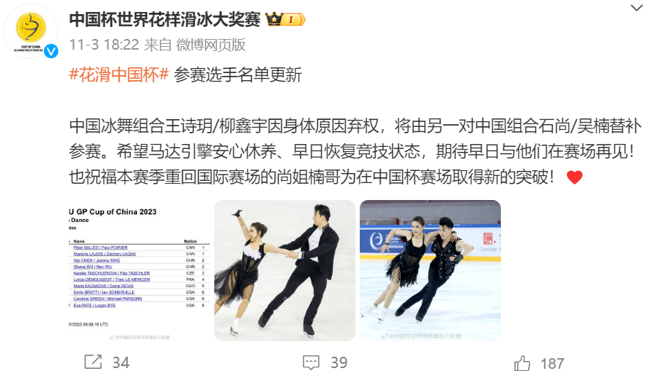 此前一天,@中国杯世界花样滑冰大奖赛 官方也公布了中国冰舞组合王诗玥/柳鑫宇因身体原因弃权,将由另一对中国组合石尚/吴楠替补参赛。