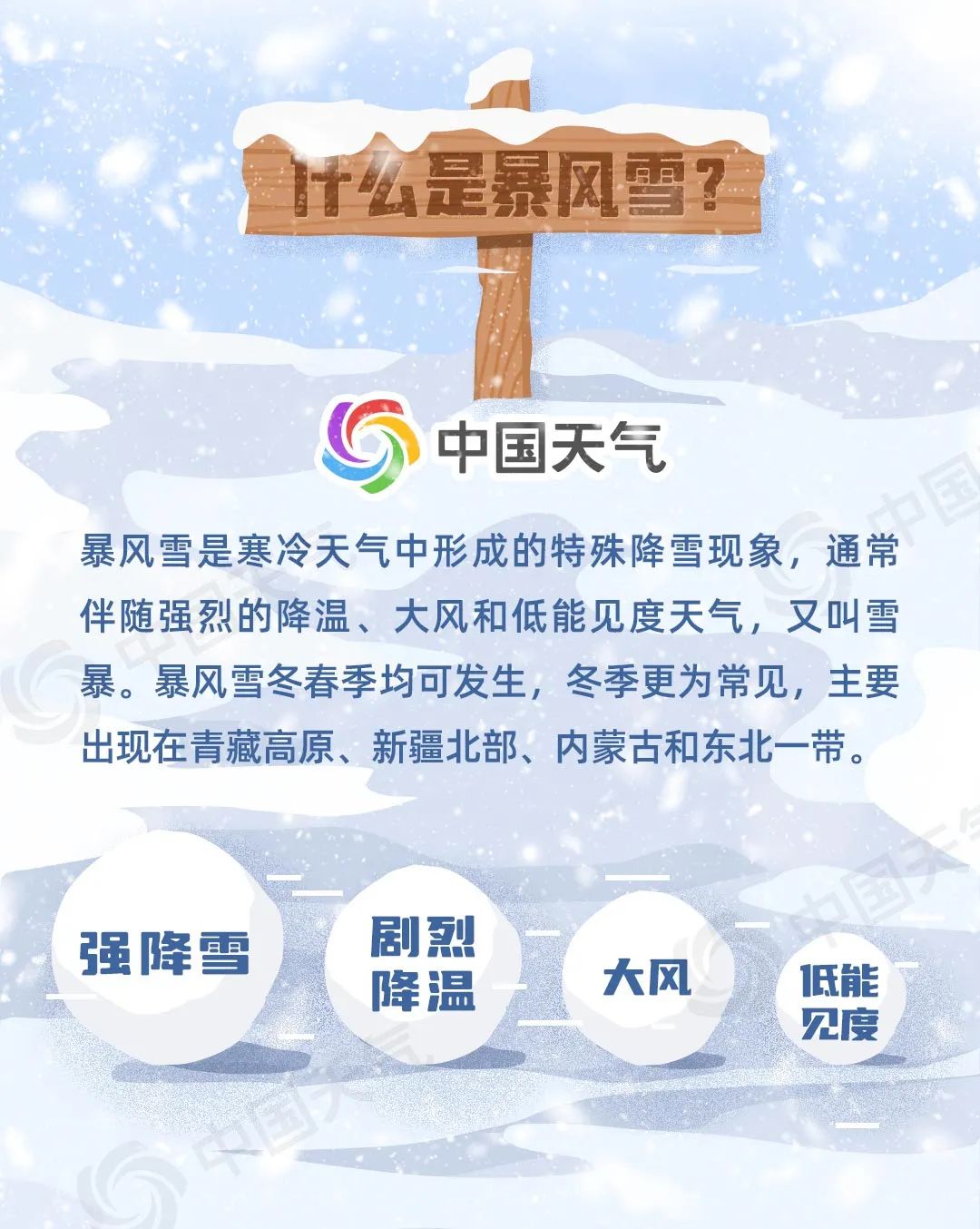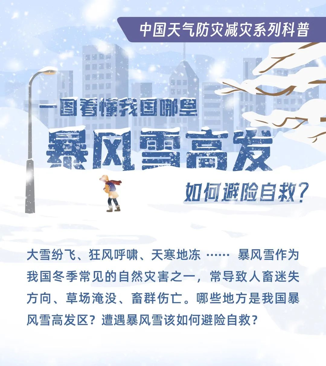 降雪同时伴随大风,也就是我们常说的暴风雪。暴风雪作为我国冬季常见的自然灾害之一,常导致人畜迷失方向、草场淹没、畜群伤亡。哪些地方是我国暴风雪高发区?遭遇暴风雪该如何避险自救?中国天气网推出防灾减灾系列科普之暴风雪,一图掌握暴风雪防御指南。
