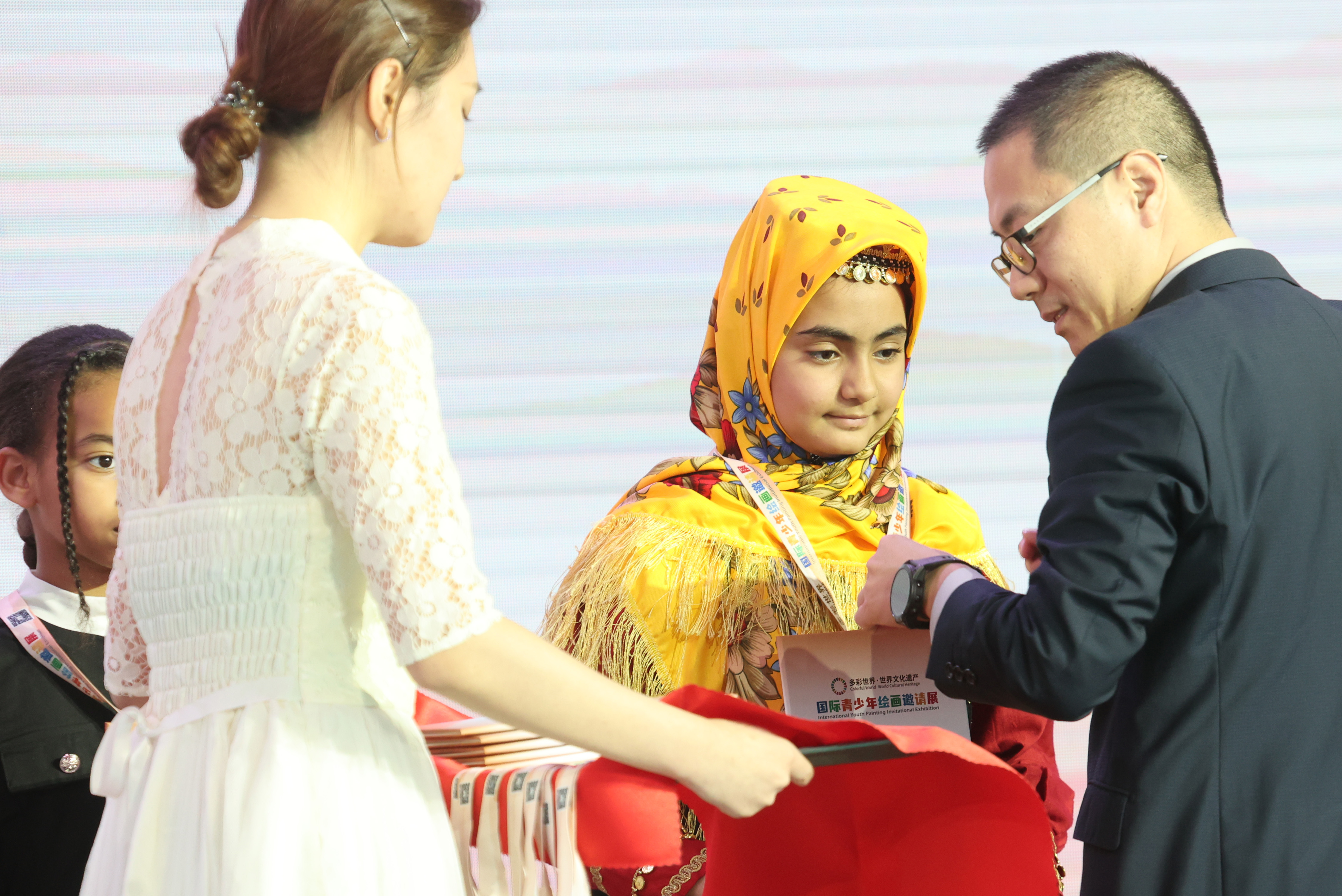 11月6日,2023“多彩世界·世界文化遗产”国际青少年绘画邀请展颁奖典礼暨展览开幕式在中国电影博物馆举行。开幕现场,小画家们共同展示了他们精心绘制的“一带一路”国家世界文化遗产、中国十大世界文化遗产、多彩北京中轴线三条绘画长卷,诠释开放包容、互学互鉴的丝路精神。