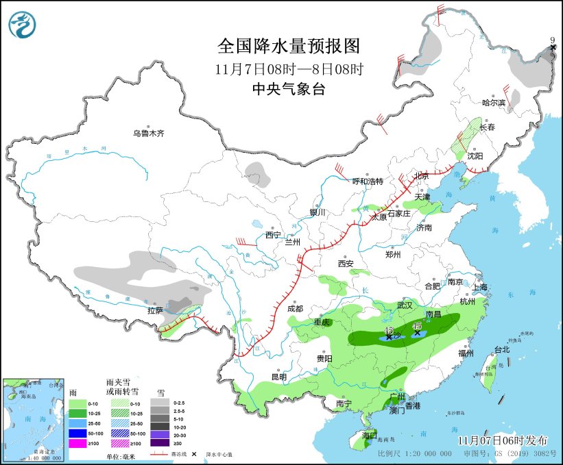 图1 全国降水量预报图(11月7日08时-8日08时)