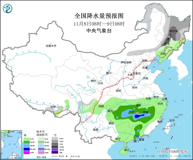 11月8日08时至9日08时,内蒙古东部、东北地区大部等地部分地区有小雪到中雪或雨夹雪,其中,吉林中西部、黑龙江南部等地局地有大到暴雪(10~14毫米)。江南大部、华南大部、西南地区东部等地部分地区有小到中雨,局地有大到暴雨(50~70毫米)。内蒙古西北部、福建东南部等地部分地区有4~6级风(见图2)。