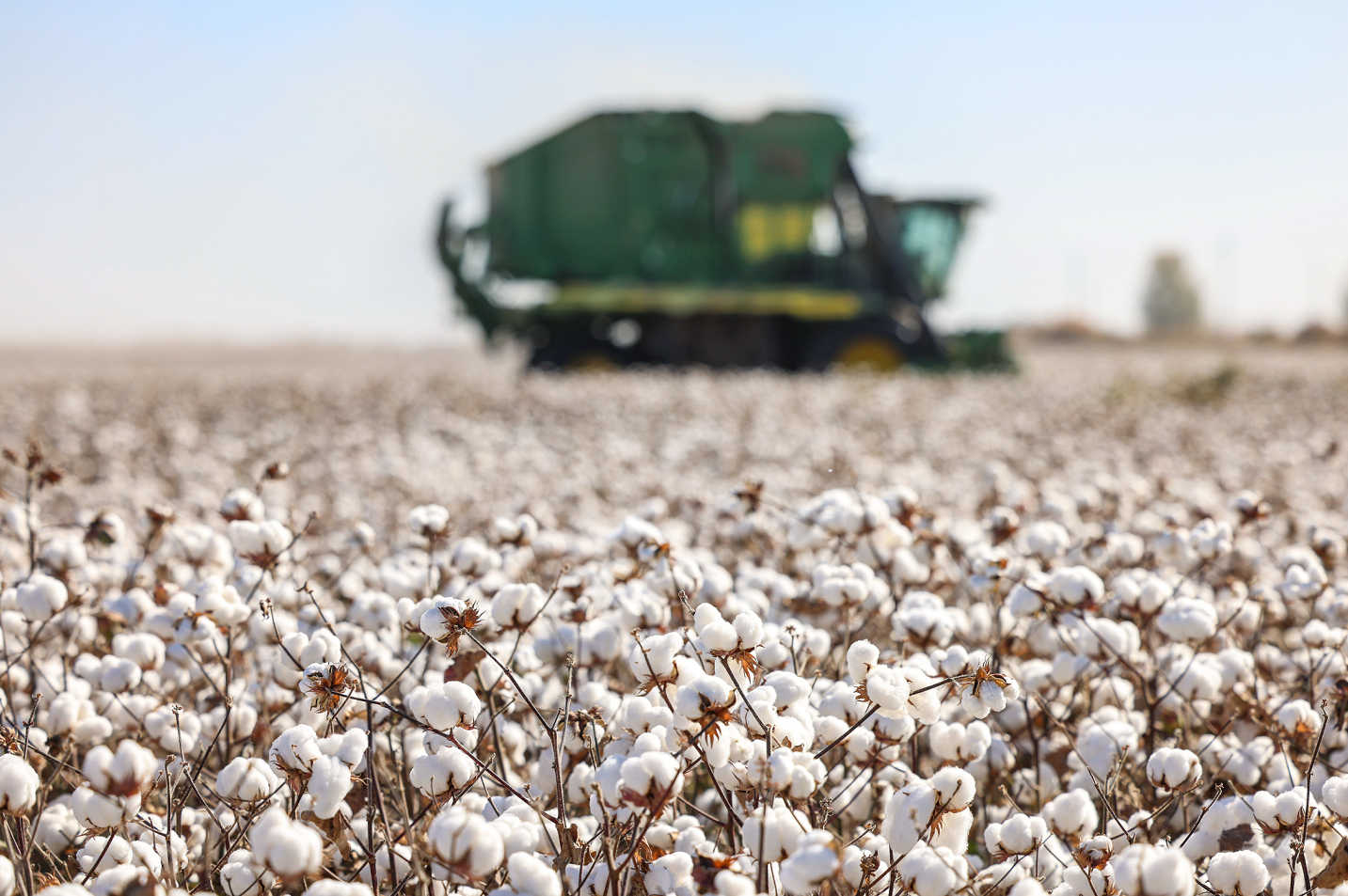 在新疆维吾尔自治区库车市墩阔坦镇亚喀守努特村的棉花地,农民驾驶大型采棉机穿梭在雪白的棉海里,加紧采收棉花,争取卖个好价钱。(新疆维吾尔自治区库车市纪委监委供 袁欢欢 摄)