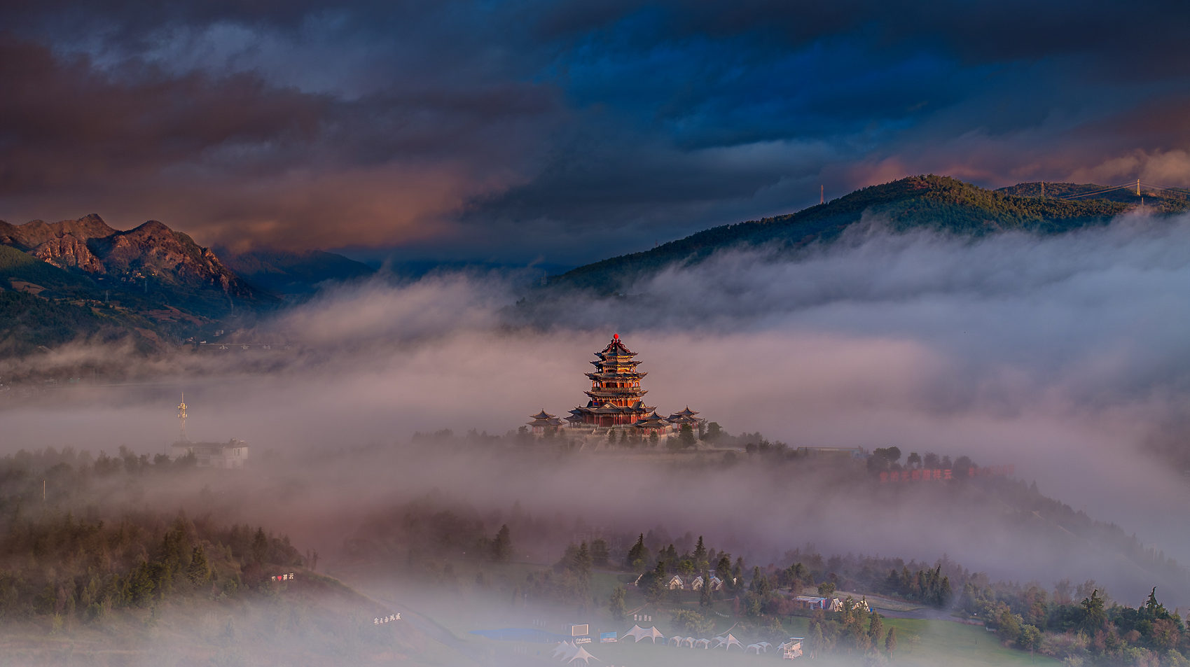 初冬的清晨,朝阳初升。在云南大理,还未完全散开的云雾,犹如一条银丝带系在山腰,如梦如幻,越过云雾,彩云南现楼在朝阳的映衬下,熠熠生辉。(云南省大理州祥云县纪委监委供 戴国辉 摄)