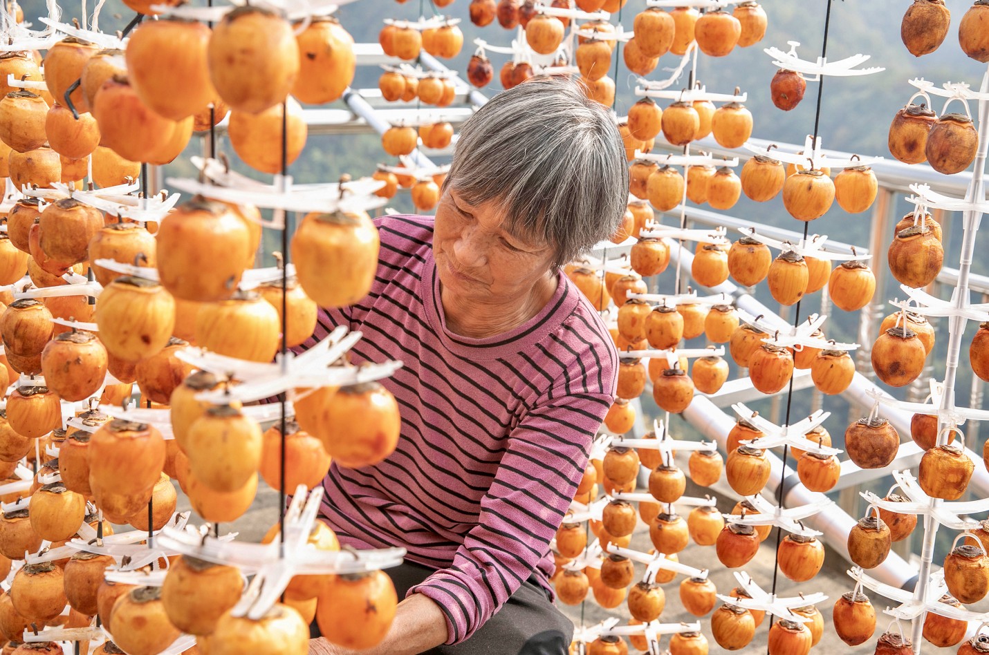 秋深渐入冬,天寒柿更甜。立冬时节,正是制作柿饼的好时候。一个个红彤彤的柿子串成串,挂在架子上自然晾晒风干,时光沉淀,静候柿霜结成,成为美味的柿饼。(杭州市钱塘区纪委监委供 陈纲 摄)