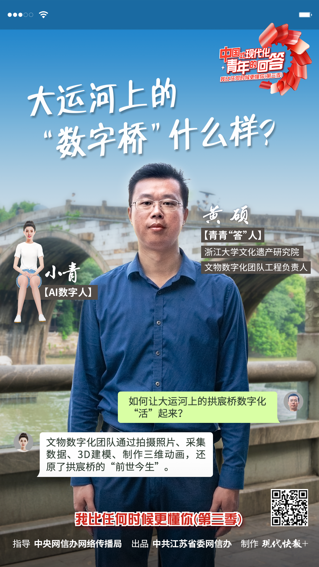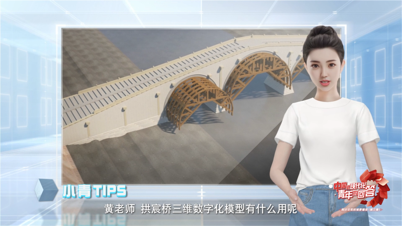 11月8日,“中国式现代化·青年的回答——我比任何时候更懂你(第三季)”系列短视频之《大运河上的“数字桥”什么样?》正式上线。在本集视频中,青青“答”人——浙江大学文化遗产研究院文物数字化团队工程负责人黄硕和AI数字人小青,带领大家打卡浙江杭州的拱宸桥,看大运河上的“数字桥”什么样?