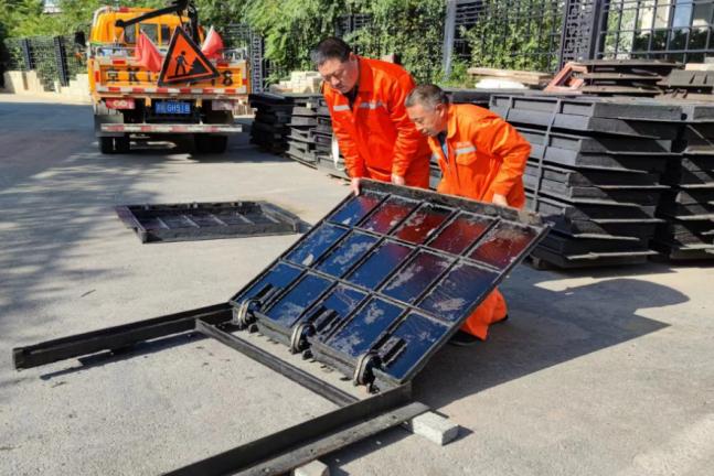 此前由于没有统一的改造标准,针对这一问题,石景山区市政所最初考虑把管井周围的弧形便道用特制材料涂成夜光的形式,如此一来,在缺少路灯的便道就会非常醒目,可以一定程度上避免安全事故。但通过调研后发现,辖区内缺少路灯的便道并不多,如果这样改造,可能会造成资源的浪费,而且不能从根本上解决问题。最终,市政所决定积极尝试新工艺新材料,通过在井盖上方安装可开启式检查井盖板,完美实现了井盖板与人行步道的齐平衔接,既保证了人行步道的连续和完整,同时又不影响检查井的正常使用和维修,还有效杜绝了道路安全隐患。“骑沿井”盖板整体为球墨铸铁材质,盖板和底架之间由可移动挂钩合页连接,可180度翻折,内部有一个类似于插销的装置,遇到紧急情况很方便拆卸。