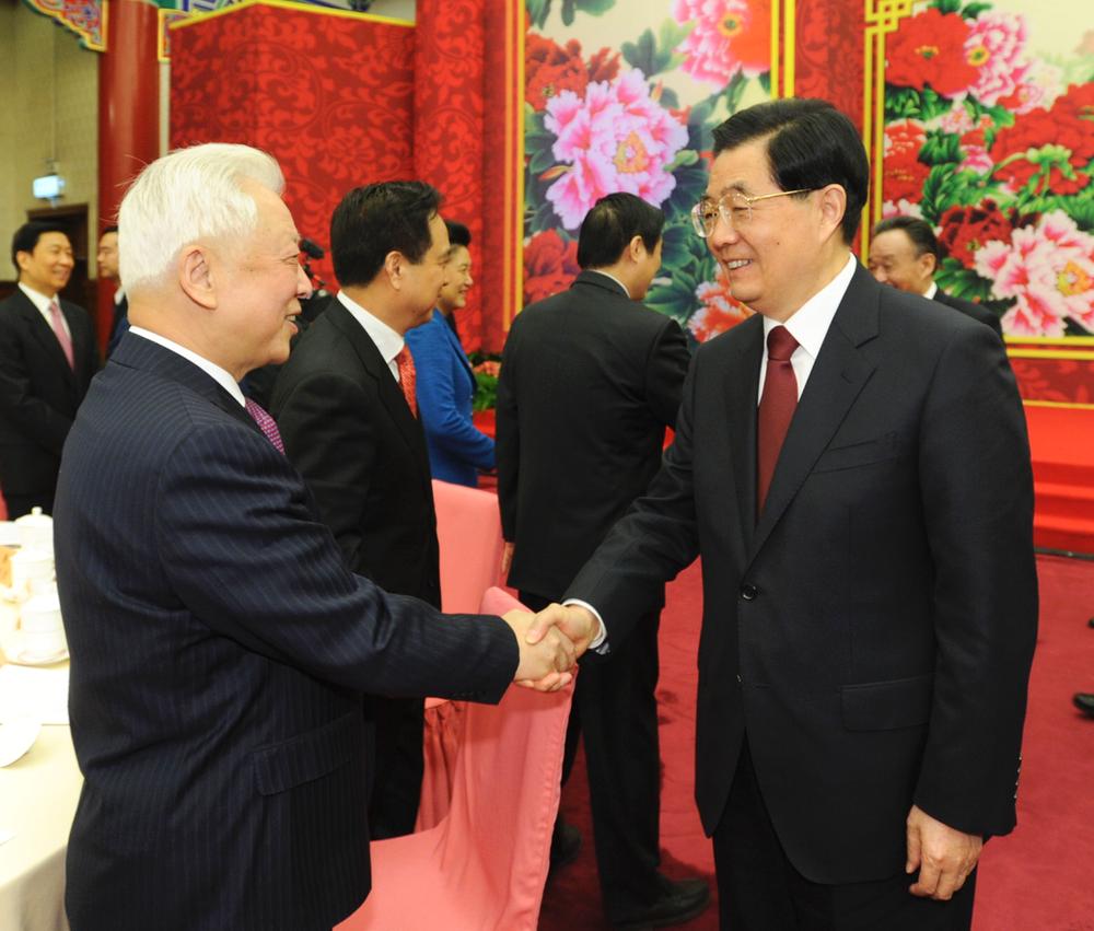 2013年1月1日,全国政协在北京举行新年茶话会。这是胡锦涛同志与周铁农同志握手。新华社记者 谢环驰 摄