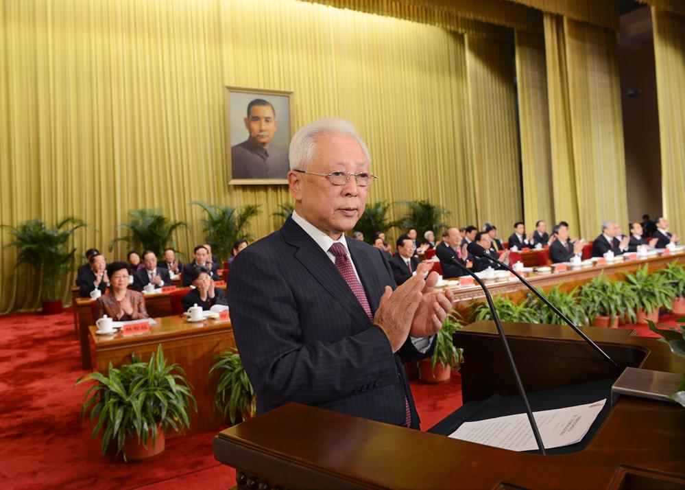 2012年12月12日,中国国民党革命委员会第十二次全国代表大会在北京开幕。这是周铁农同志代表中国国民党革命委员会第十一届中央委员会作工作报告。新华社记者 饶爱民 摄
