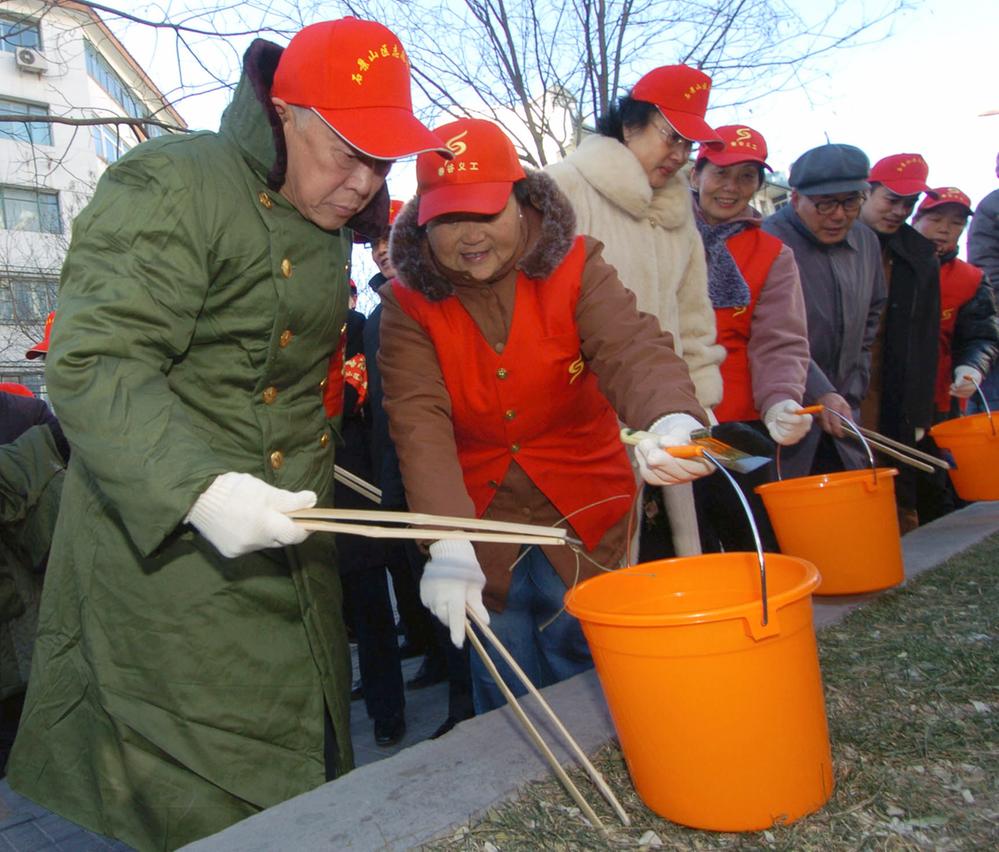 2005年12月5日,世界第二十个国际志愿者日当天,周铁农同志在北京石景山区鲁谷社区参加社区志愿服务活动,和其他几位义工一起清除草坪中和人行过道上的杂物。新华社记者 王建华 摄