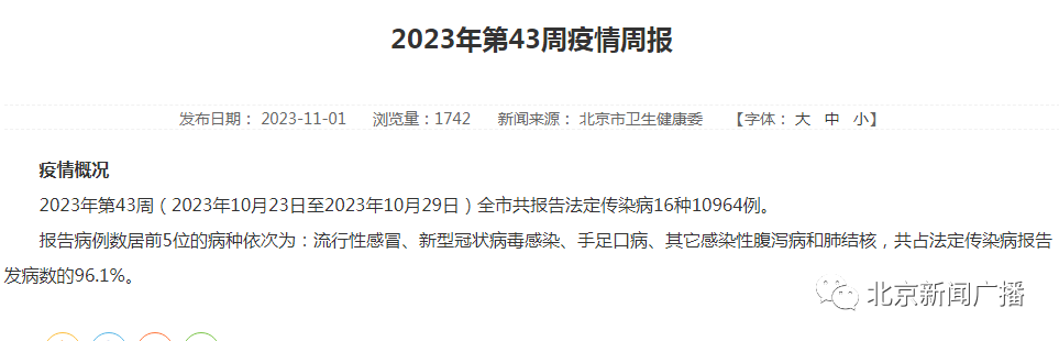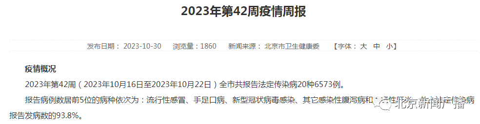 此前,据北京市疾病预防控制中心网站发布的2023年第42周、第43周疫情周报,流行性感冒均为报告病例数最多的病种。