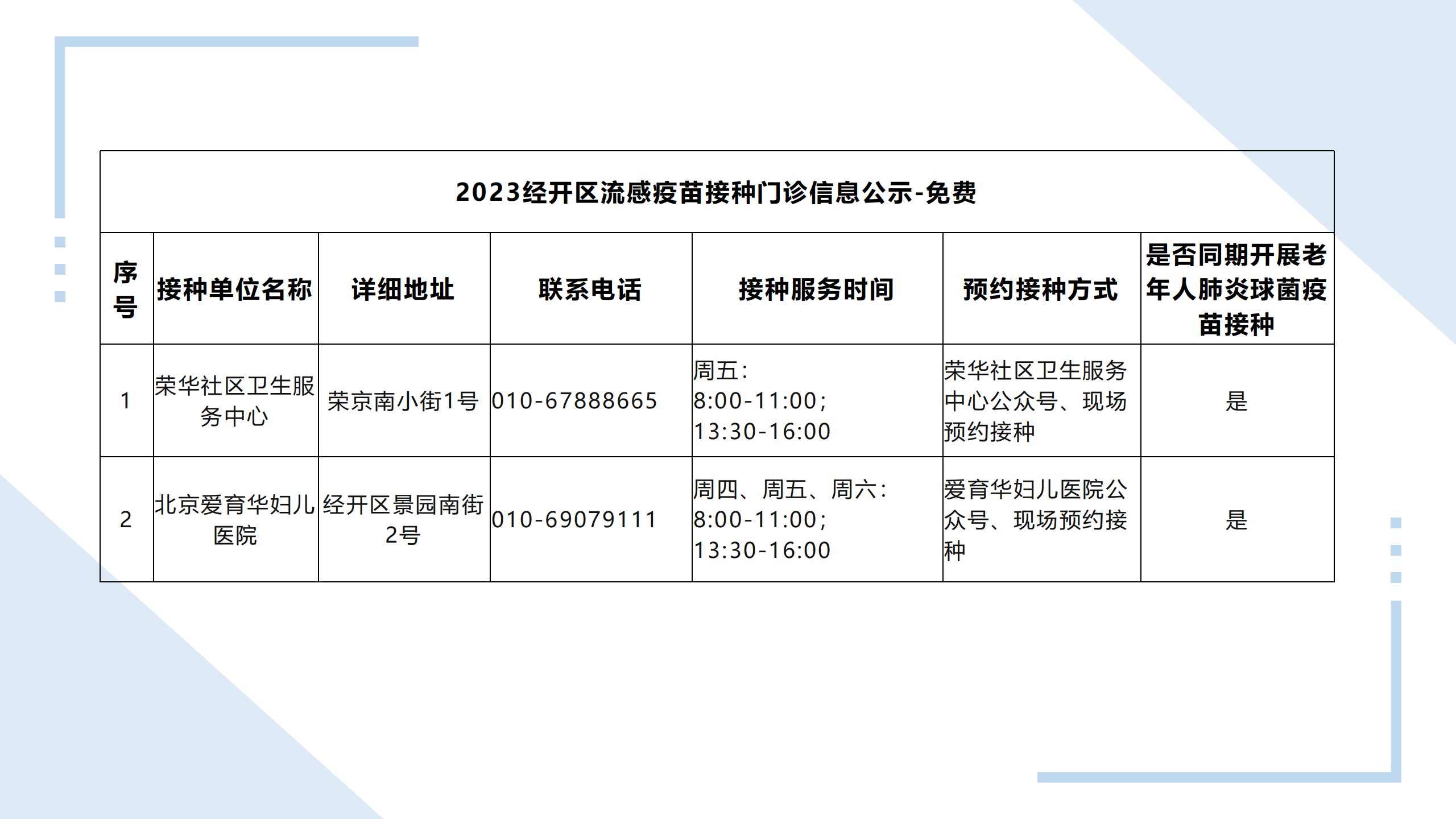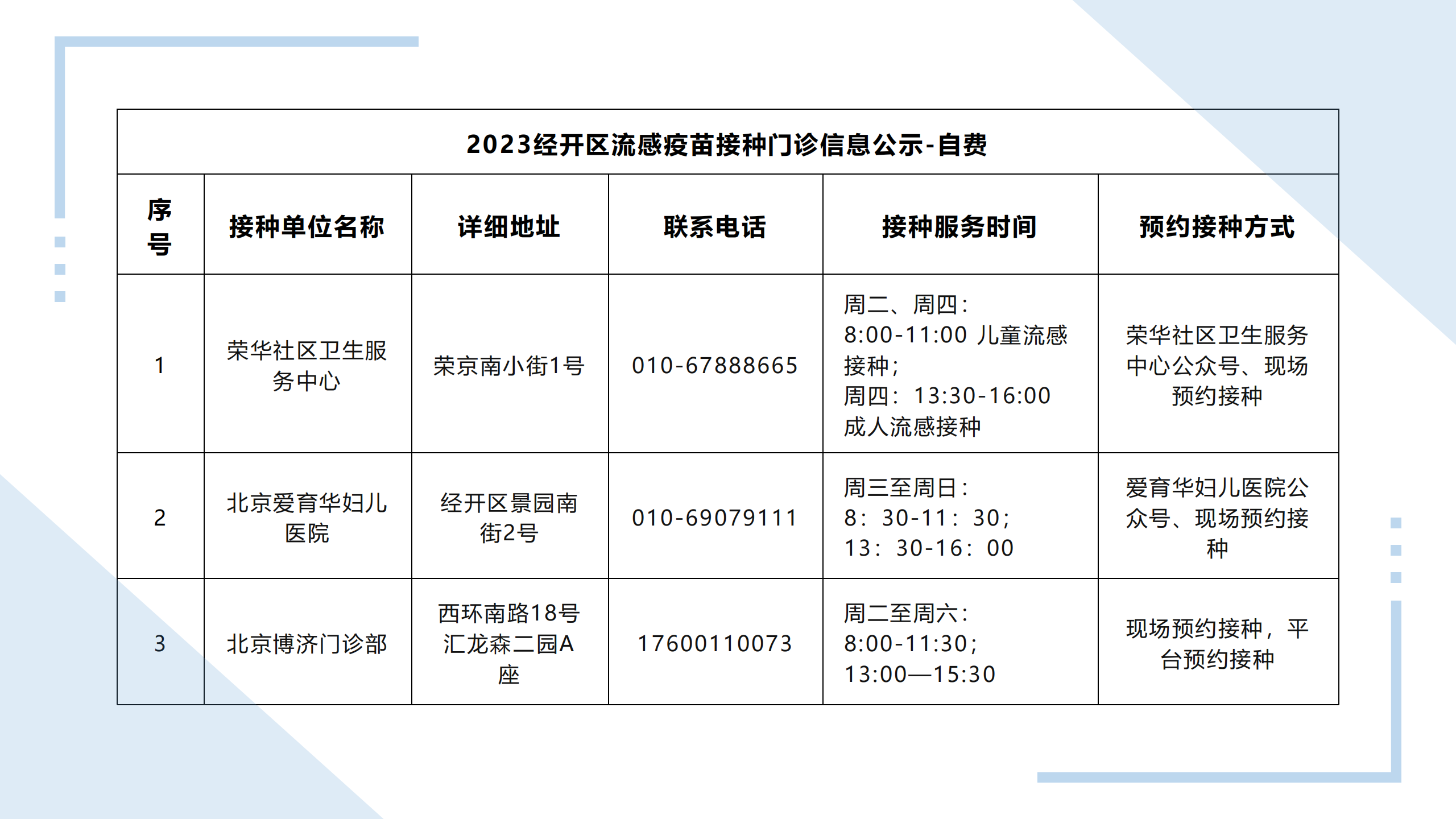 今年经开区共统筹设立荣华社区卫生服务中心、北京爱育华妇儿医院、北京博济门诊部三个流感疫苗接种服务点。荣华社区卫生服务中心、北京爱育华妇儿医院可同时提供免费、自费接种服务;北京博济门诊部仅面向成年人提供自费流感疫苗接种服务。