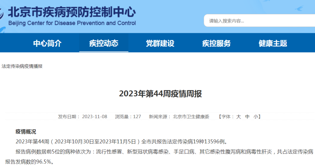 11月8日,北京市疾病预防控制中心网站发布的北京市2023年第44周疫情周报显示:全市共报告法定传染病19种13596例。报告病例数居前5位的病种依次为:流行性感冒、新型冠状病毒感染、手足口病、其他感染性腹泻病和病毒性肝炎,共占法定传染病报告发病数的96.5%。