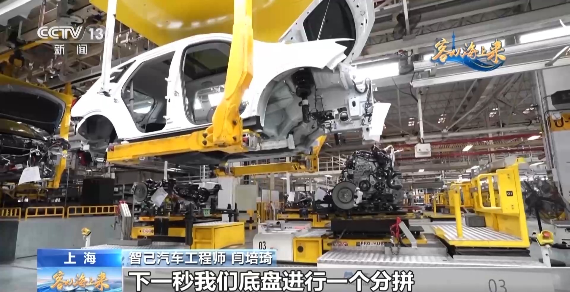 智己汽车工程师 闫培琦:上一秒这辆车的上车体过来,下一秒我们底盘进行一个分拼,这都是经过销售系统和我们的物流系统进行数据云交换,再通过我们的MES制造系统(生产执行系统)进行跟踪,进行一个制造。