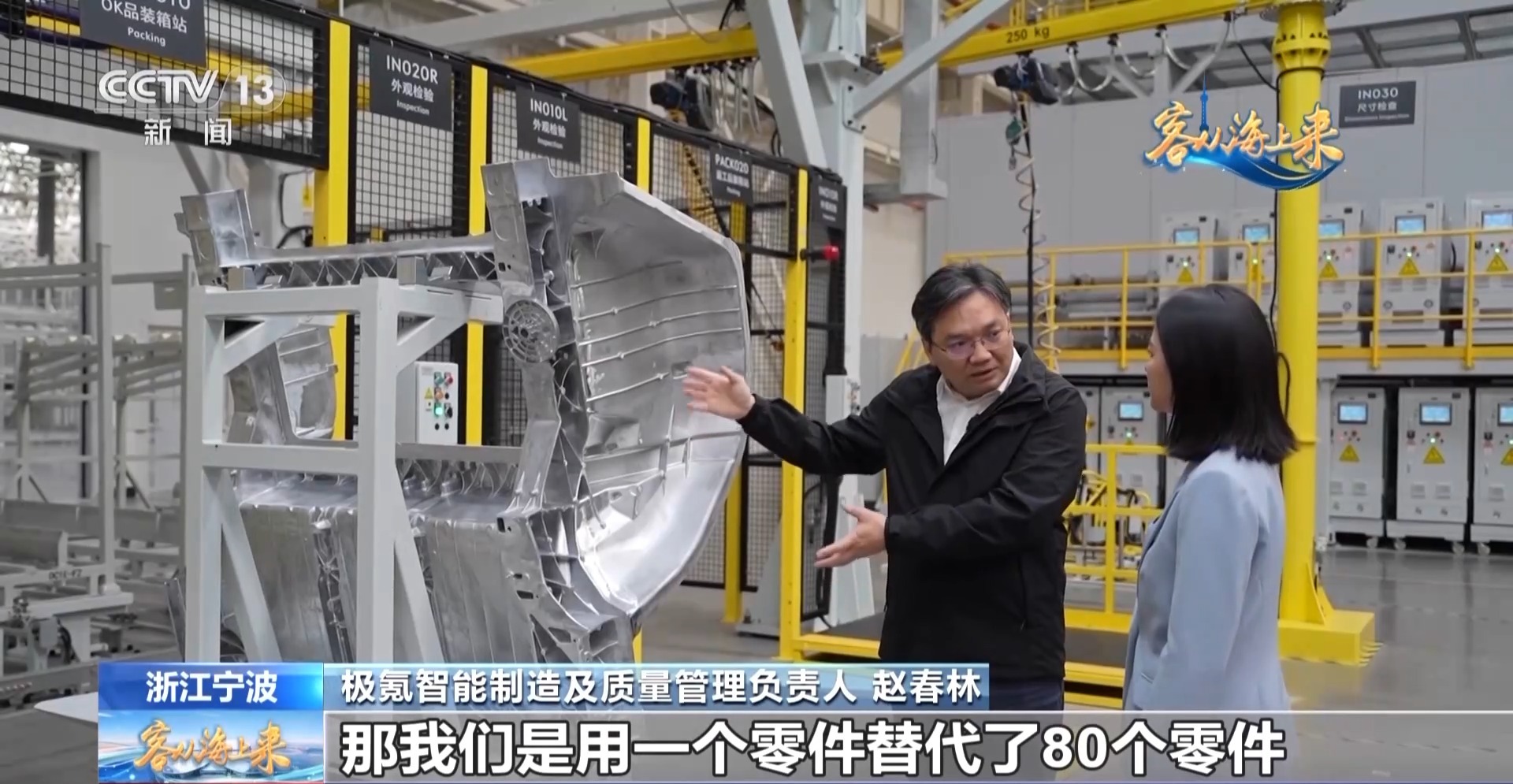 极氪智能制造及质量管理负责人 赵春林:这个后底板实际上是在传统造车里边,需要把这里面80多个零件集成到1个零件。生产过程中,制造的时间从5个多小时缩短到80秒钟。