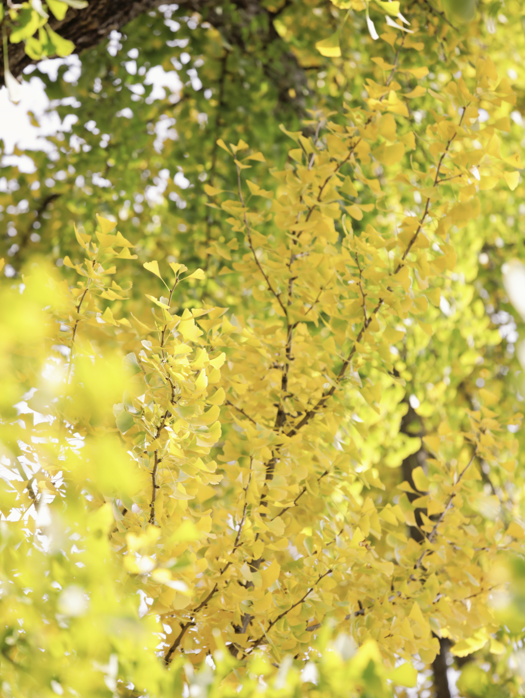 银杏树叶与阳光晕染成温暖的金黄