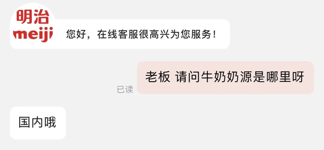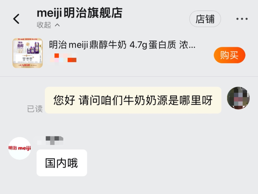 在国内,两家电商平台的明治网店客服表示,明治为日本品牌,但其售卖产品均为国内奶源。