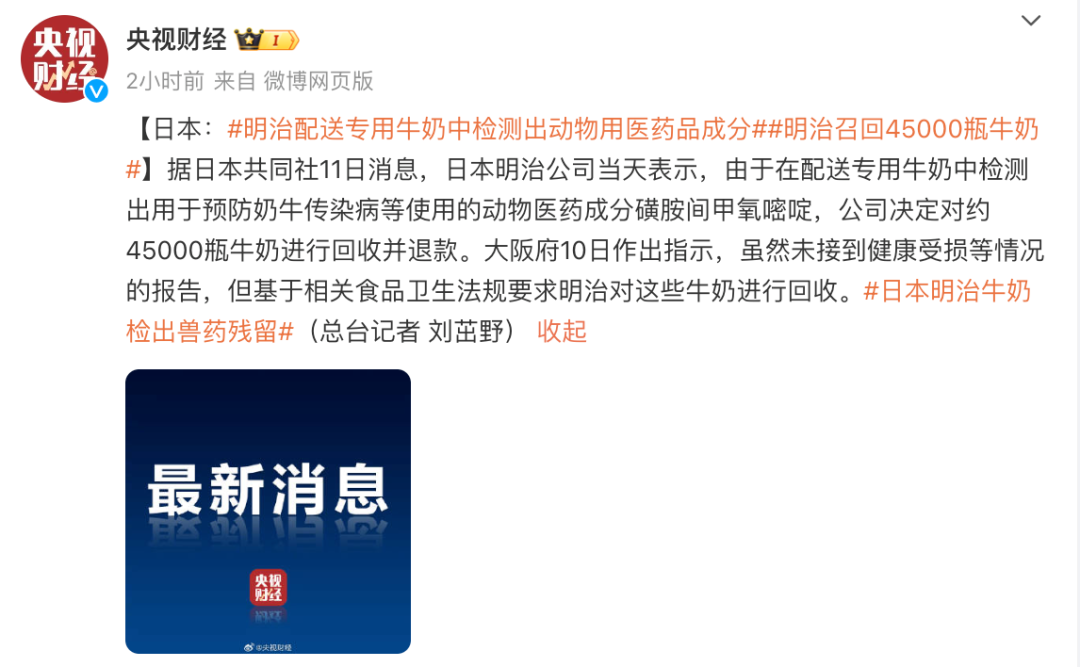 当地时间11月6日,当地政府对工厂进行检查时发现了兽药残留,按照食品安全有关规定,命令明治公司召回问题产品。