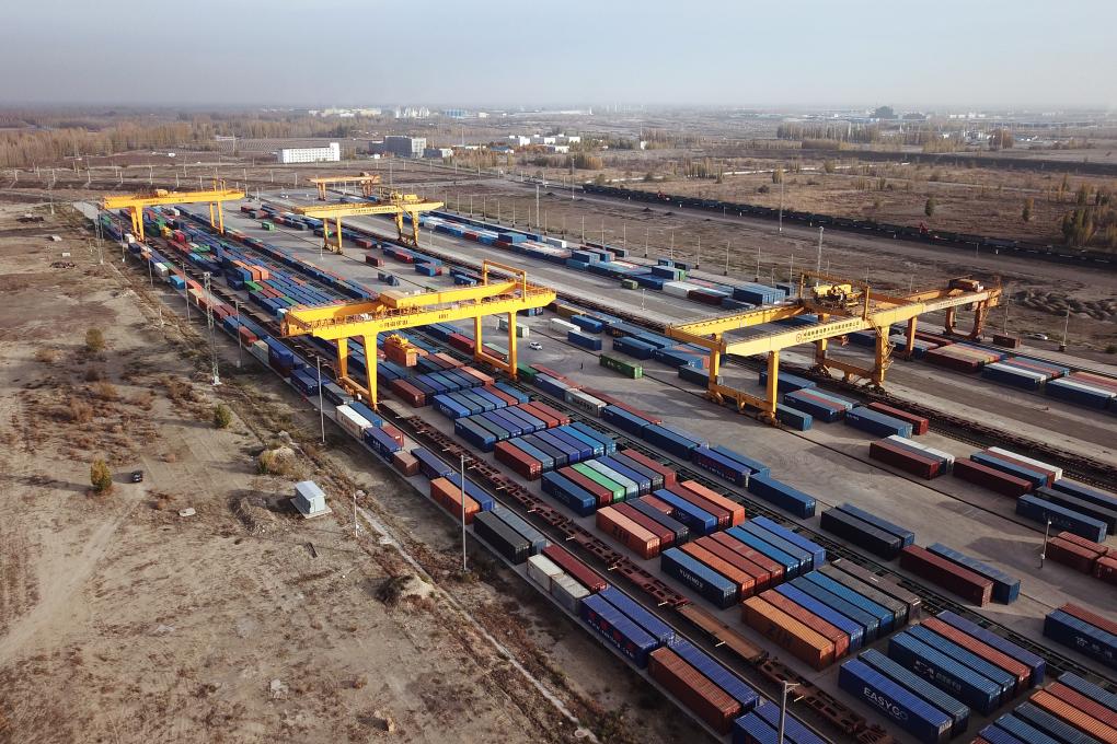 11月8日,霍尔果斯铁路口岸站(无人机照片)。新华社记者李鑫 摄