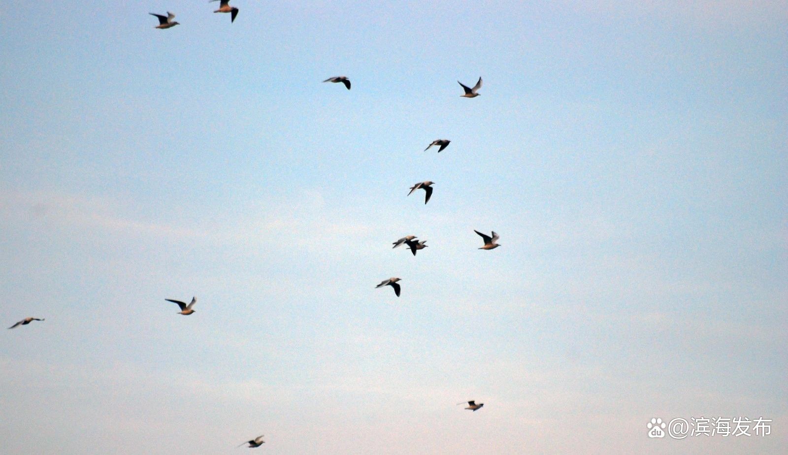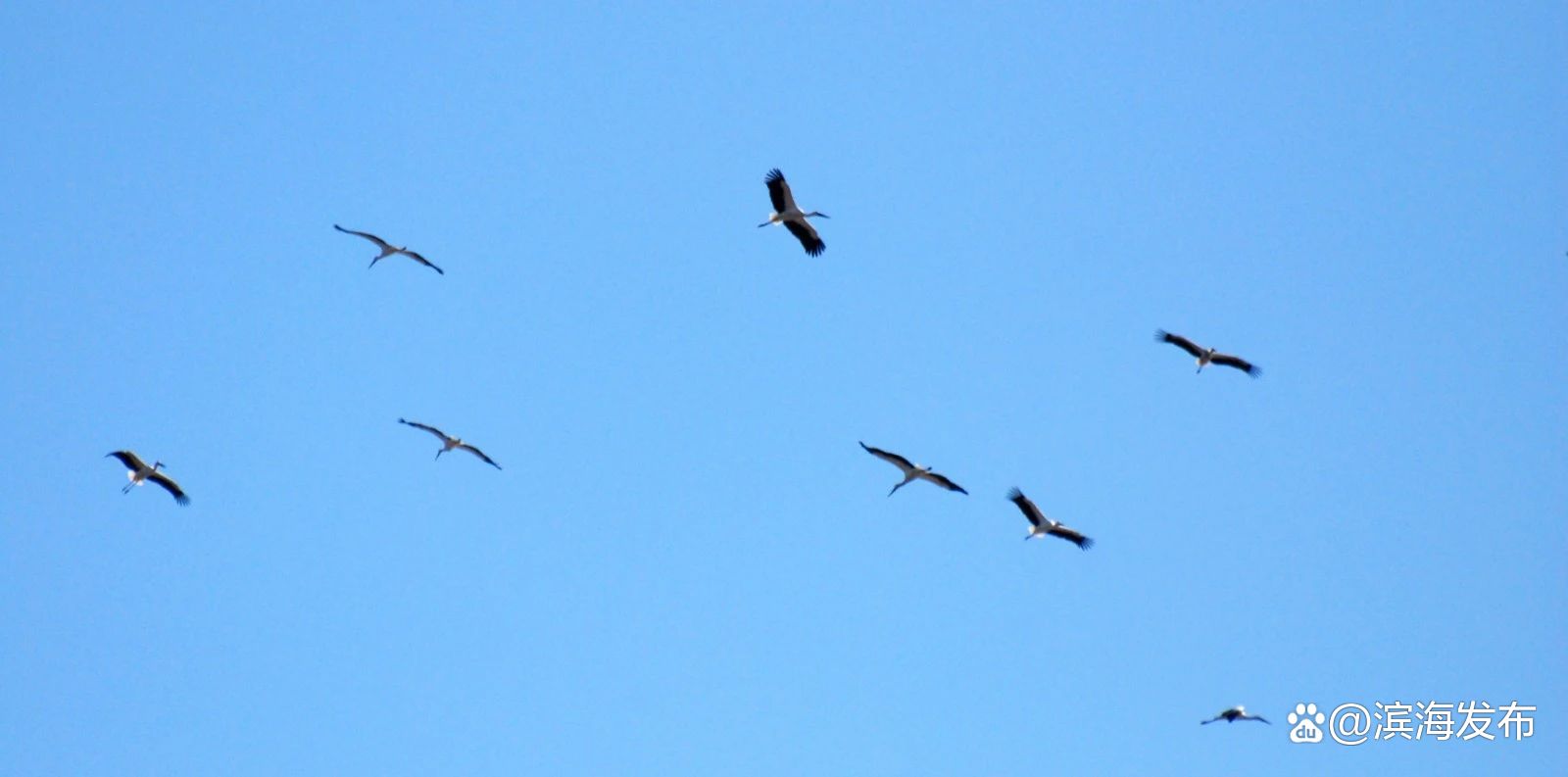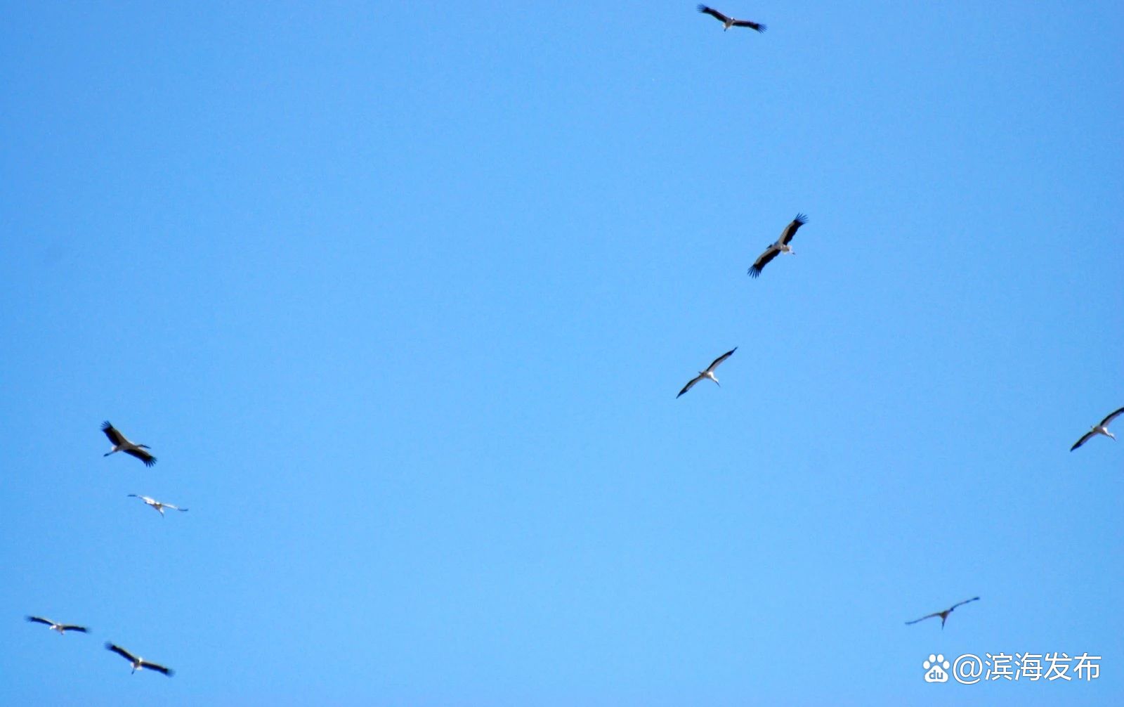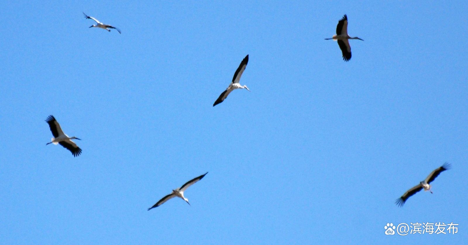 这两天,受冷空气影响,持续多日大风降温后的滨城天空,风轻云淡,碧空如洗。秋冬交替季节,漫步各大公园、河畔,草木葳蕤,鸟儿蹁跹,美景如画,让人心旷神怡。成群的东方白鹳自东向西迁徙而来,飞得很高,它们时而在空中变换着队形飞翔盘旋,时而在空中稍作停留即刻远行。在蓝天的映衬下,勾勒出一幅空中灵动的生态画卷,煞是好看。